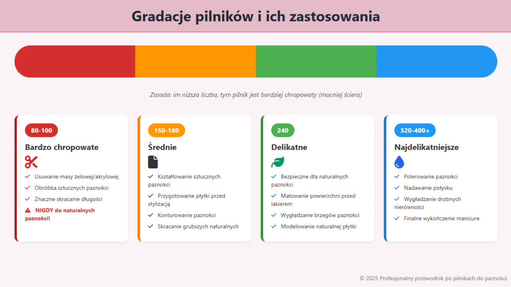 Pilniki o gradacji 80-100 służą wyłącznie do usuwania sztucznych paznokci i znacznego skracania długości. Ich agresywna powierzchnia szybko usuwa masę akrylową lub żelową, ale niszczy naturalną płytkę paznokcia.